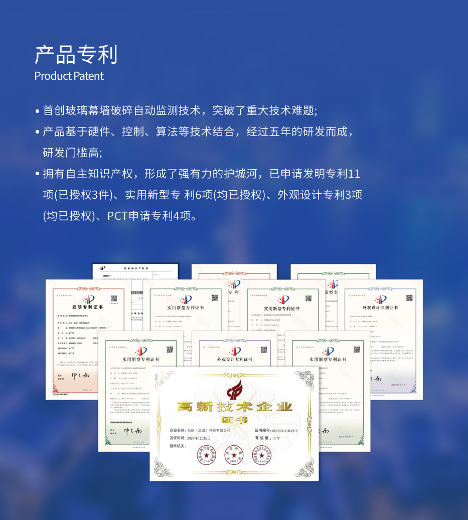 公司现阶段的主要产品聚焦于建筑外立面智能监测,该系统综合集成了光学成像、多光谱成像、激光成像、电机扫描控制、大数据量采集和存储、快速数据处理、异常信息提取、结构设计与集成等多方面的技术和方法,与传统的人工检测、内部布设传感器检测等方法不同,本公司基于主被动激光成像方法实现全天时不间断自动检测,全方位对疑似破碎玻璃幕墙进行扫描、诊断和预警,综合所获取的光斑、影像等多种信息进行破碎的异常特征提取,该方法在国内尚属首次,填补了国内外高层玻璃幕墙玻璃破碎自动检测领域的空白,解决了该领域长期困扰的重大技术难题。