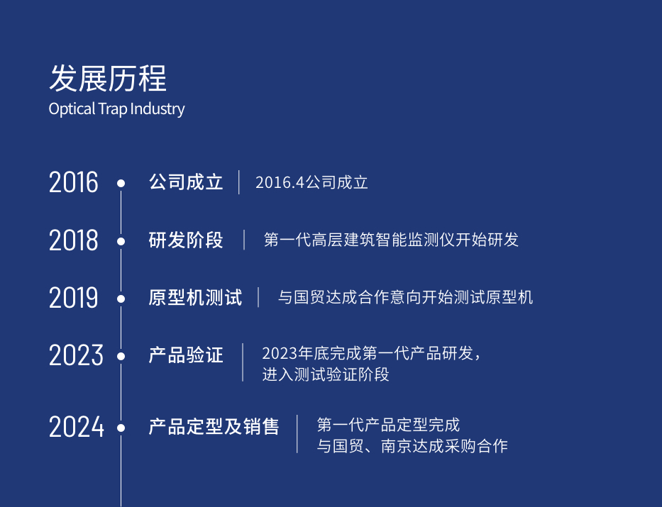 光阱科技于2016年4月成立,是中关村高新技术企业,国家高新技术企业。主要业务领域包括高层建筑智能监测设备、航空航天高分辨率载荷、半导体测试设备、高端显微成像装备等。